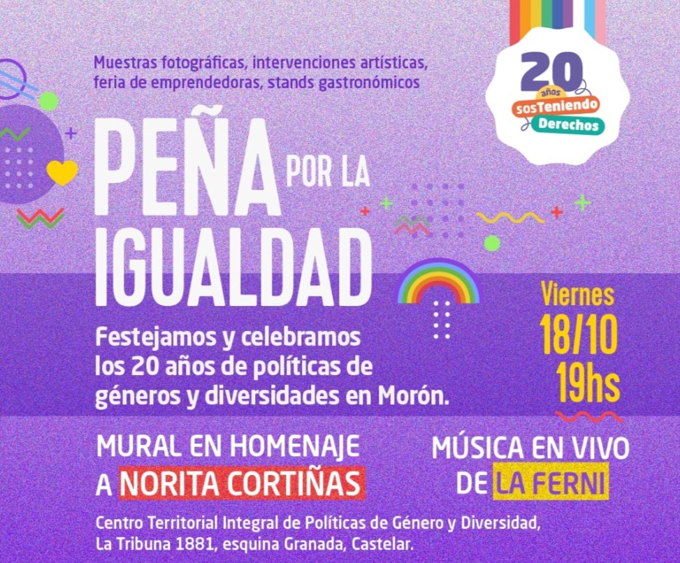 El Municipio de Morón celebrará 20 años de implementación de políticas públicas en materia de género con una peña por la igualdad. Será el próximo viernes 18 de octubre, a partir de las 19hs, en el Centro Territorial Integral de Políticas de Género y Diversidad (La Tribuna 1881, Castelar).
