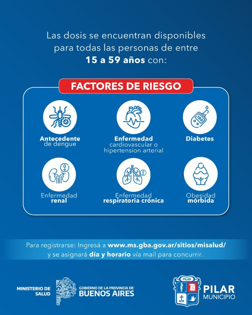 El dengue es una enfermedad viral que se transmite a las personas a través de la picadura del mosquito aedes aegypti. Las personas con factores de riesgo ante esta infección son aquellas que sufran enfermedades cardiovasculares, renales, respiratorias crónicas, hipertensión arterial, diabetes, obesidad mórbida o que ya hayan cursado un cuadro de dengue anteriormente.