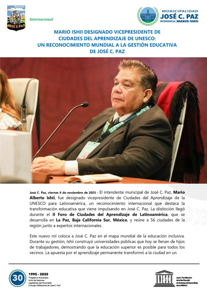 El intendente municipal de José C. Paz, Mario Alberto Ishii fue designado vicepresidente de Ciudades del Aprendizaje de la UNESCO para Latinoamérica, un reconocimiento internacional que destaca la transformación educativa que viene impulsando en José C. Paz. La distinción llegó durante el II Foro de Ciudades del Aprendizaje de Latinoamérica, que se desarrolla en La Paz, Baja California Sur, México, y reúne a 56 ciudades de la región junto a expertos internacionales.