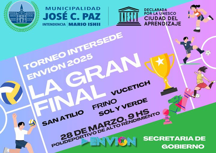 Este sábado a partir de las 9 hs en el nuevo polideportivo se dará comienzo a la final del TORNEO INTERSEDES ENVIÓN edición 2025, dónde las sedes de los B° Sol y verde, Vucetich, San Atilio y Frino, jugarán en las diferentes disciplinas por los premios que brindamos a través de la Gestión del Intendente en uso de licencia y actual Senador Prov. Mario Ishii.